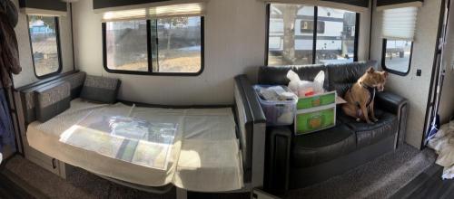 We now have two twin beds, with clearance underneath for more and more easily accessible storage than before, in our slide out. (And it’s lighter than what was already there.) We can all comfortably sit together and we can all comfortably use tables together in the same space at the same time!! We could not do that before. I found some fantastic folding tables that store under the first bed, easy in/out and opened/closed, that enable this. We can also use the tables elsewhere. If the kids are doing desk work and Chris needs to have some separation to work or have a meeting, he can take a desk back to the bunk and sit on Phoebe’s bed/couch while the kids and I are in the main space. If we want more space during meal prep, table up! It is working like a charm. I hope the honeymoon period never ends!
